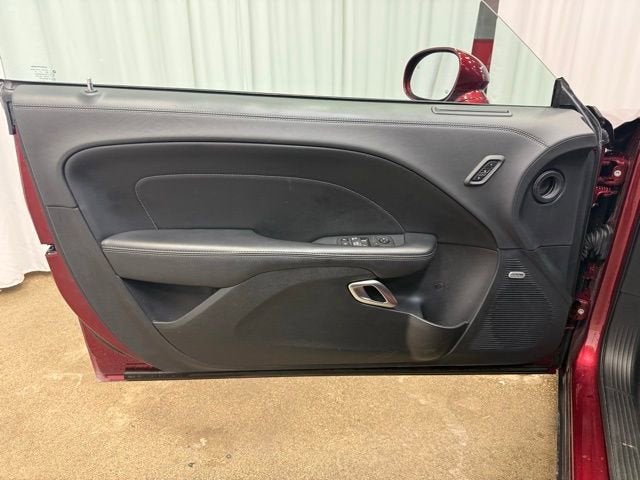 The sleek, bold exterior of this Challenger R/T is sure to turn heads wherever you go. The red paint gleams in the sunlight, complemented by the aggressive styling cues like the Shaker hood, black grille, and rear spoiler. Step inside and you'll be greeted by a premium, driver-focused cabin with high-quality materials, ambient lighting, and a memory system for the driver's seat, mirrors, and steering wheel.